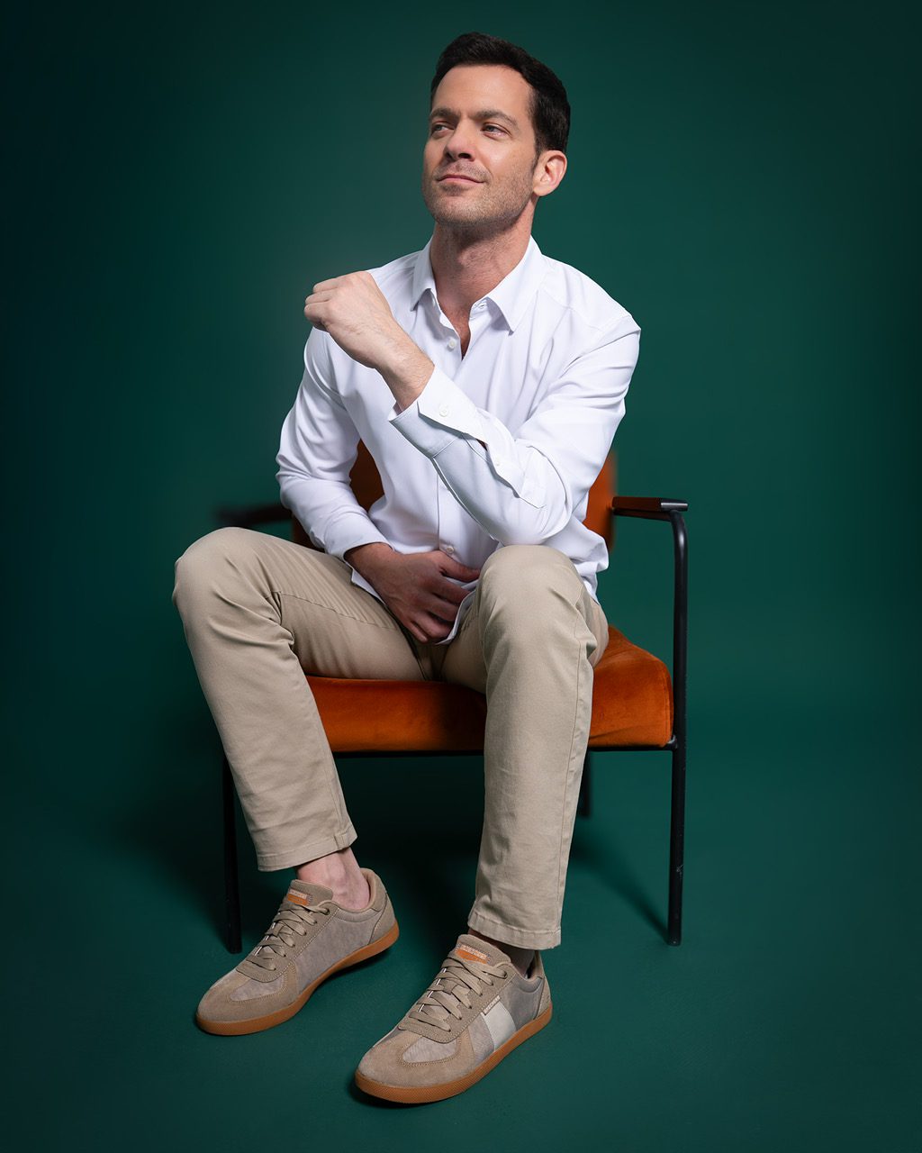 Outfit recomendado: Pantalón chino, camisa oxford y blazer desenfadado. El toque ideal: sneakers de cuerina estilo streetwear, fáciles de combinar y con un acabado moderno.
