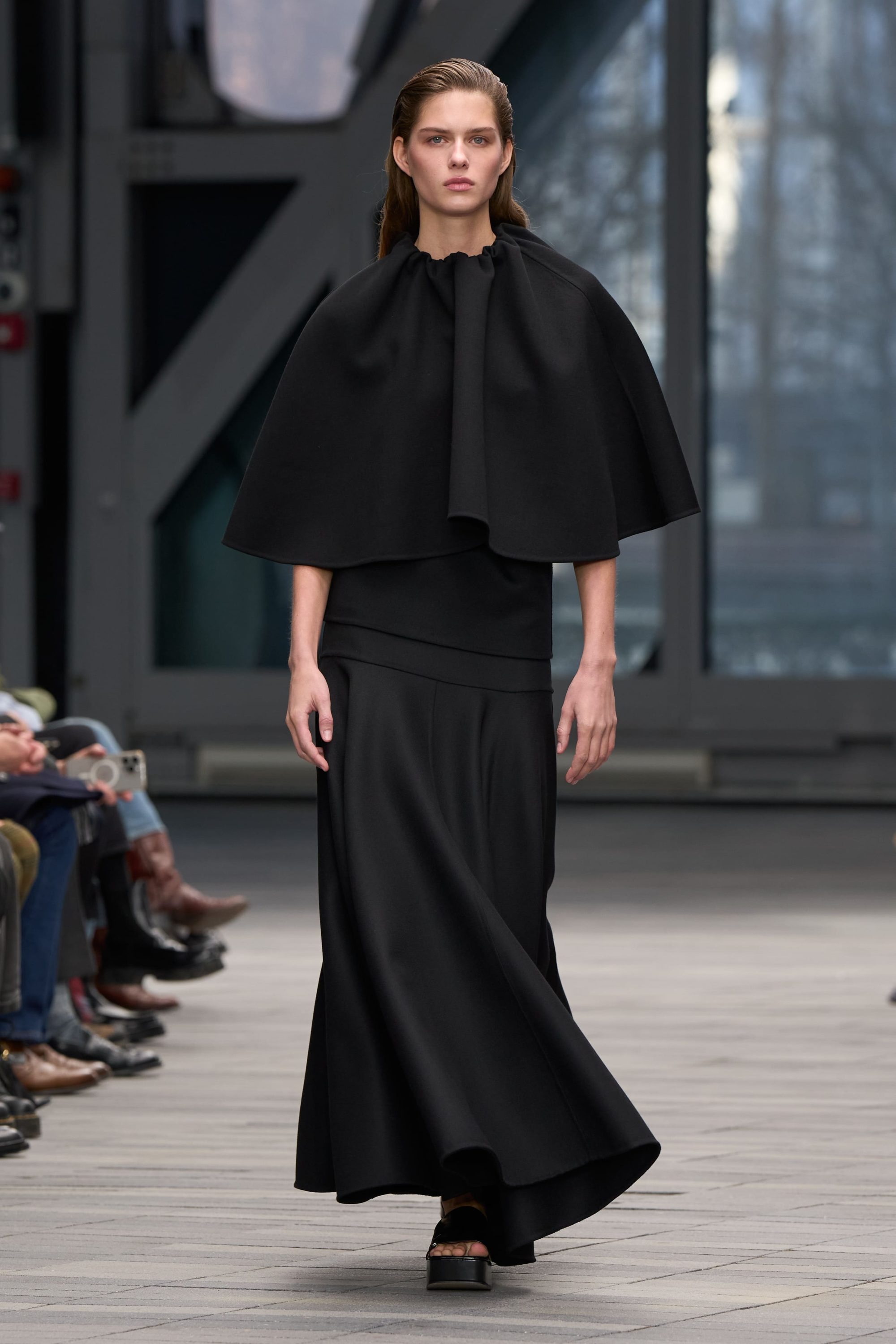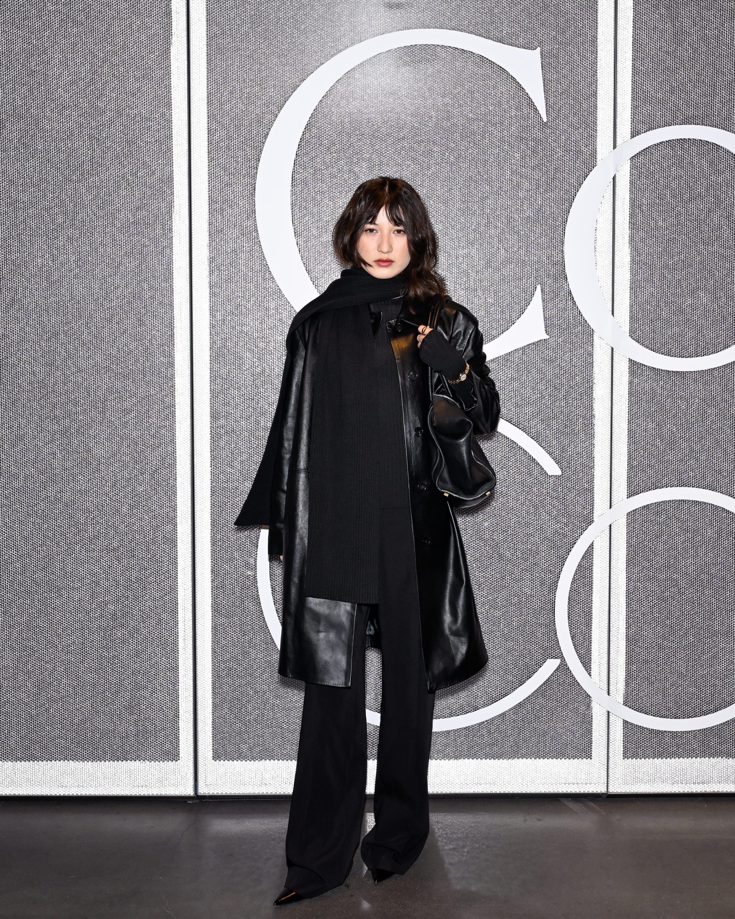 Cuellos blancos emergen con protagonismo, mientras que los cuellos tipo biker aportan un toque rudo, y los cuellos de shearling sugieren grandeza antes de expandirse en un abrigo completo de shearling. La textura y el color definen una escena urbana de tonos neutros y matices sobrios, ocasionalmente iluminados con destellos de tangerina o burdeos. Los tejidos abarcan desde lanas de sastrería de acabado seco hasta jersey acanalado, terciopelo fluido, satén laminado, algodones, grosgrains y spazzolato, así como cueros opacos y transparentes.