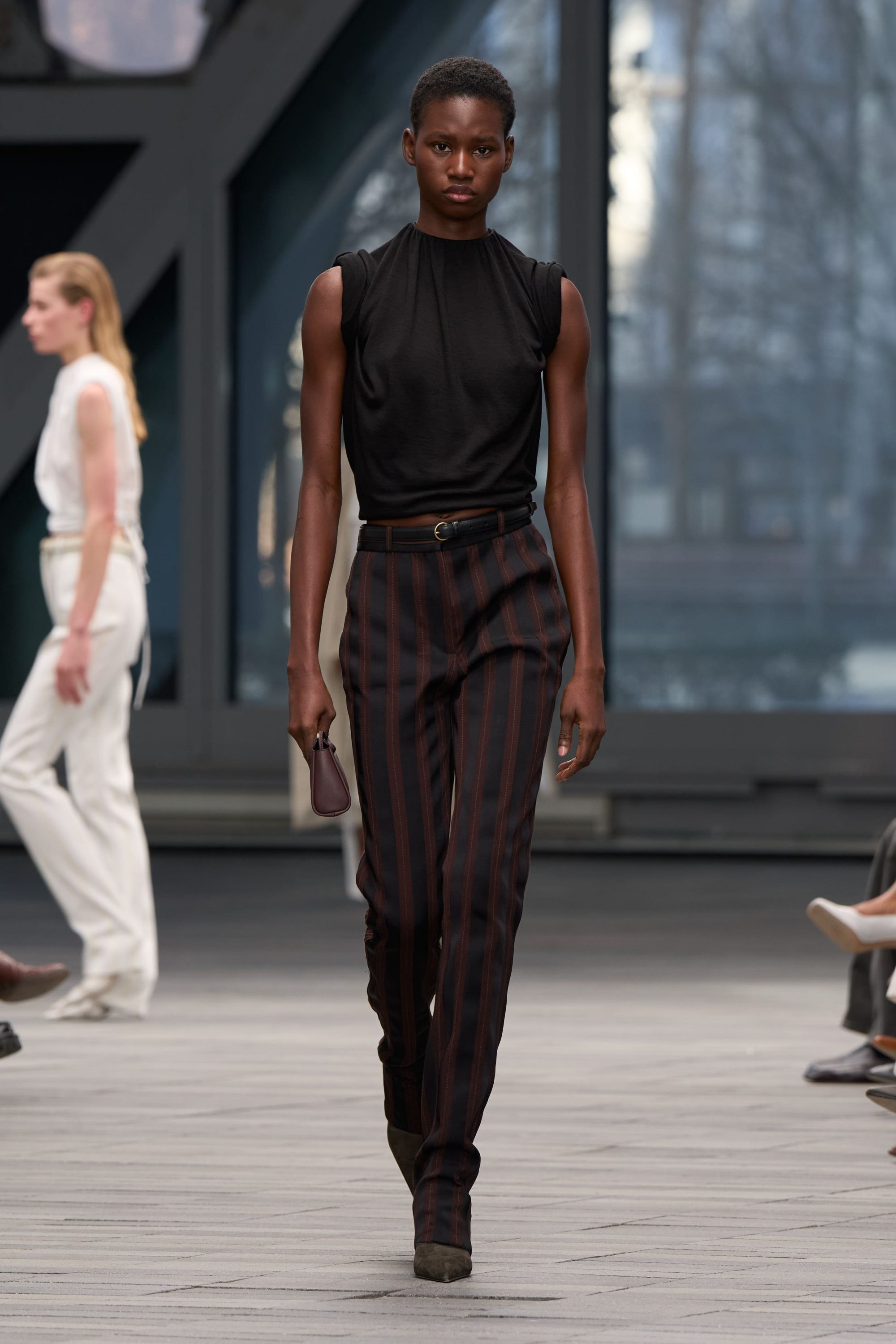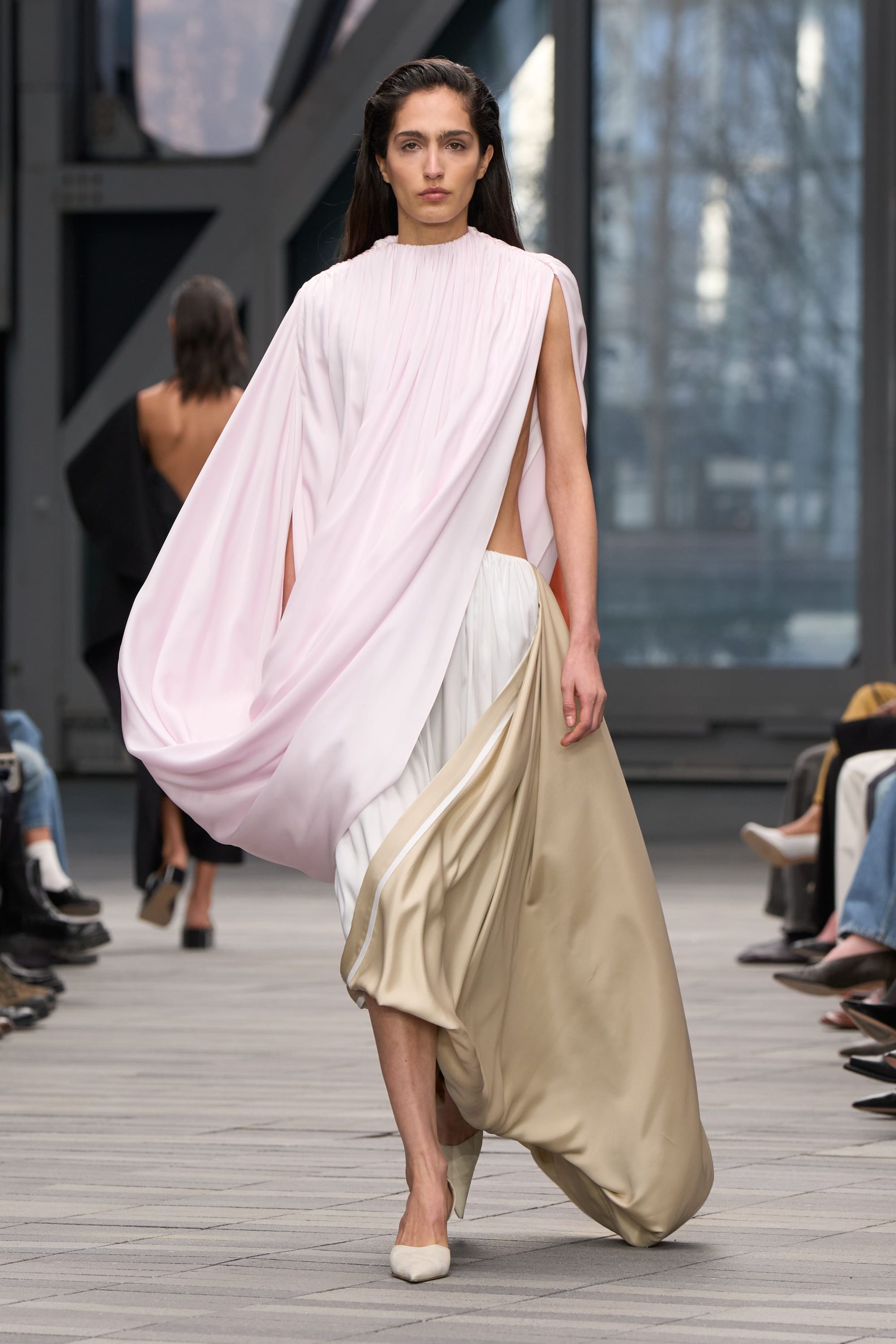 A lo largo de los distintos estilos, la silueta es alta y recta; la sastrería precisa y ajustada, con inesperadas espaldas descubiertas y detalles sin mangas, crea tensión, mientras que los vestidos intensamente trabajados presentan espaldas lisas en contraste que revelan su estructura interna.