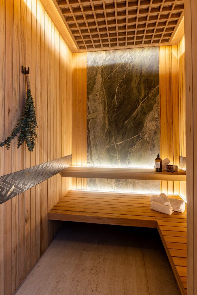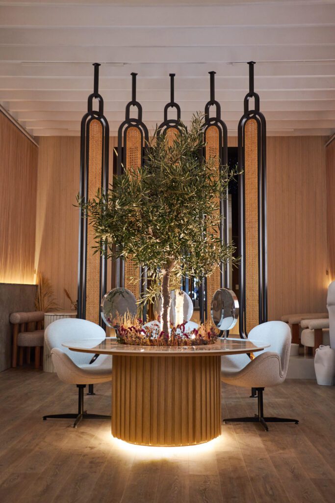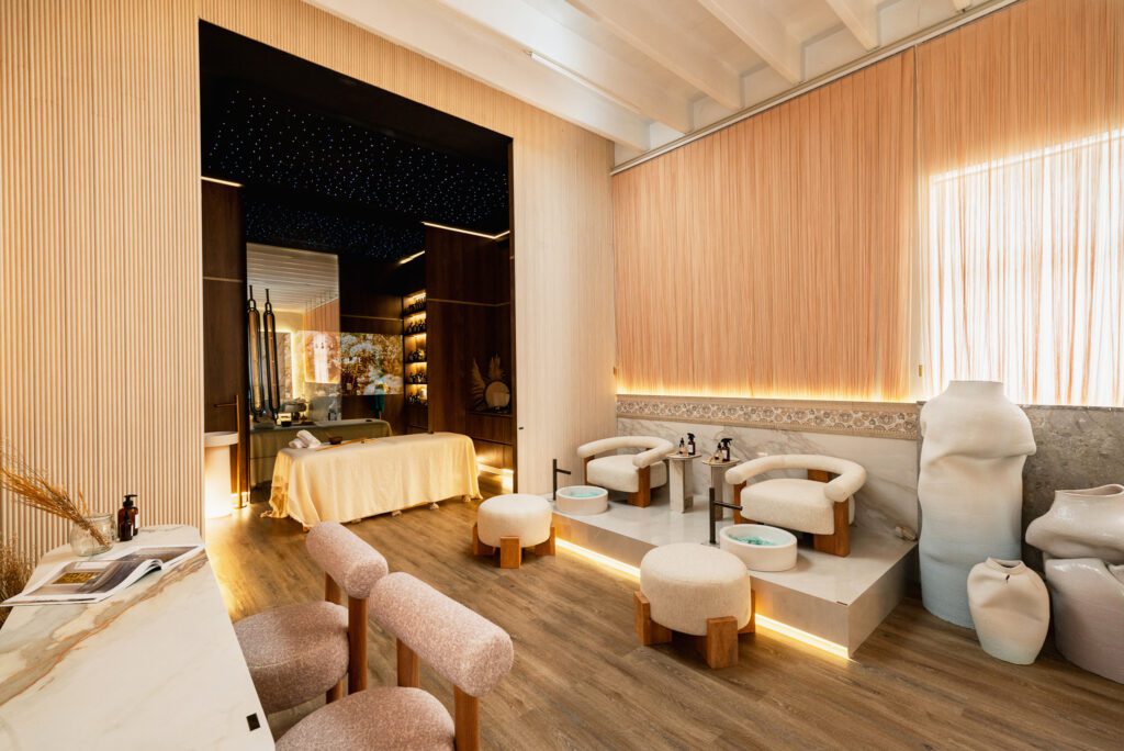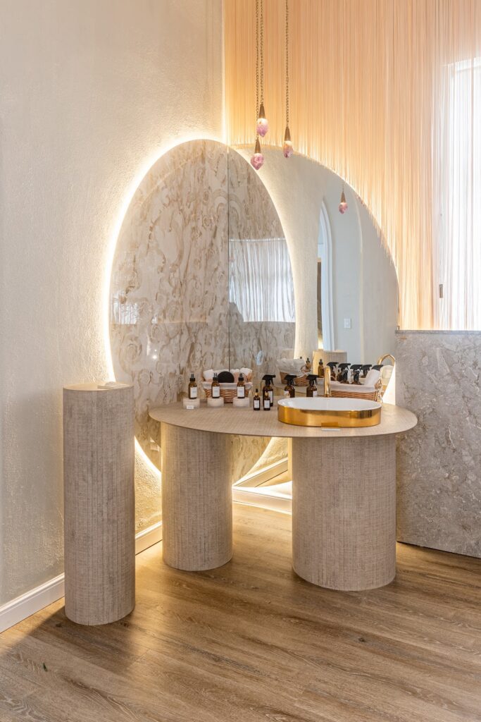 Camila Gonzalez con su empresa Camila Gos ha creado interiores que despiertan los sentidos. En Dolce Spa, los elementos naturales como las piedras preciosas, el olivo, la luz, la madera y una diversidad de texturas en telas se combinan con una iluminación cuidadosamente diseñada para crear una atmósfera perfecta. Este entorno excepcional permite a los clientes disfrutar de una variedad de terapias y tratamientos de alta gama, utilizando los mejores insumos que la madre naturaleza puede ofrecer.