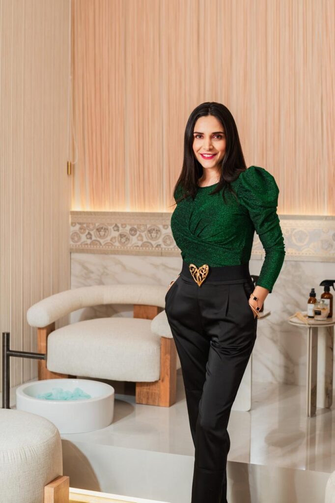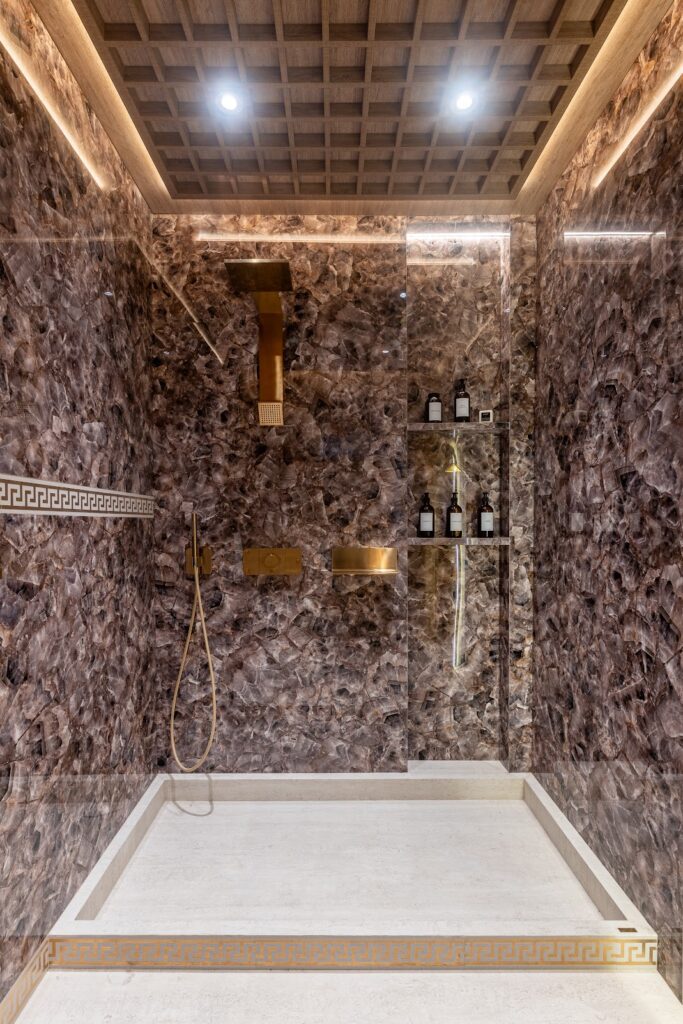 La colaboración con Inpiedra y el uso de piedras preciosas de la marca Versace han permitido que diseñe un spa que respira lujo en cada rincón. Inspirada en la temática hotelera de este año en Casacor, ha incorporado piezas únicas que aportan un toque encantador y exclusivo al proyecto, elevando la experiencia de los visitantes a un nivel superior de elegancia y sofisticación.