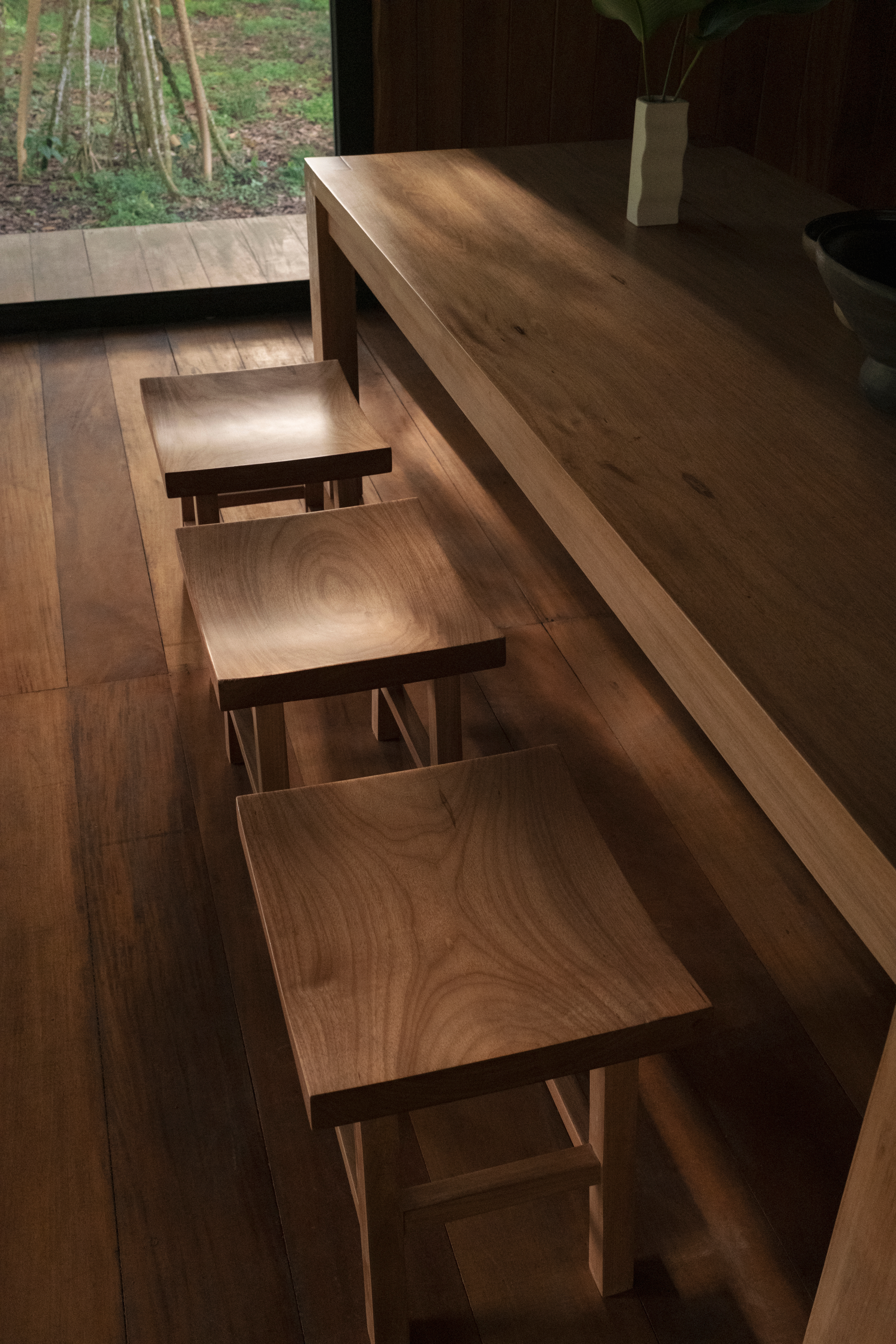 sillas fueron elaborados por carpinteros locales, y el revestimiento de piedra travertino