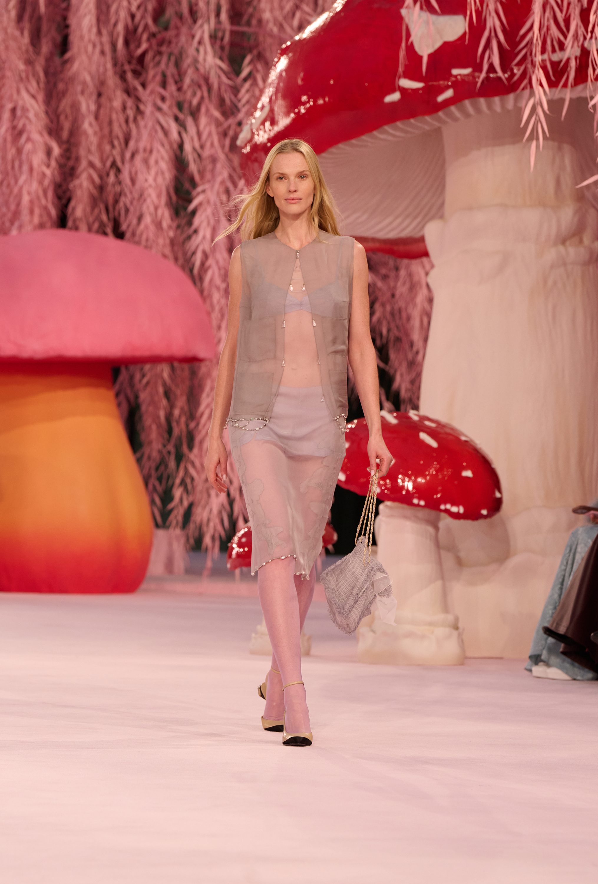 Blazy ancla la colección en los arquetipos de Chanel, pero los libera de cualquier peso histórico. Los convierte en parte de un sueño. Por un instante, la moda se detiene, se vuelve poesía y luego se desvanece.