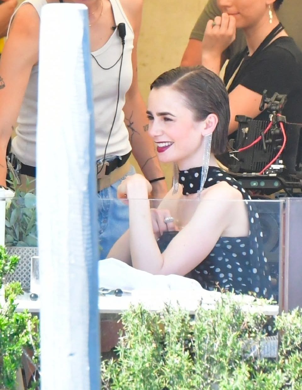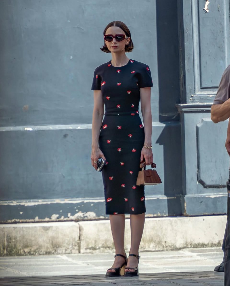 Lily Collins, en su papel de Emily, fue vista luciendo outfits que combinan el atrevimiento de su estilo con un guiño a la estética clásica italiana. En una de las escenas más comentadas, aparece con un conjunto de lunares en blanco y negro: falda acampanada hasta la pantorrilla, top a juego y pendientes de aro XL. Un look que no solo rinde homenaje a la elegancia vintage, sino que también aporta el toque juguetón y excéntrico que caracteriza al personaje. En otra toma, la actriz sorprende con un vestido mini de lunares acompañado de una bufanda delicada al cuello y unos pendientes largos con destellos brillantes, completando el look con un labial rojo intenso que realza el aire sofisticado.