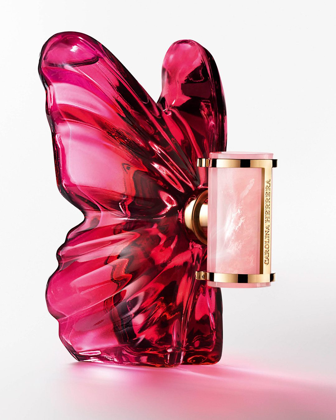 El frasco, convertido en un auténtico objeto de deseo, adopta la forma de una mariposa de cristal en intenso tono fucsia, coronado por una piedra inspirada en el cuarzo rosa. Más que un envase, es una pieza de arte que refleja la fuerza visual, la feminidad de la diseñadora y la estética de la fragancia.