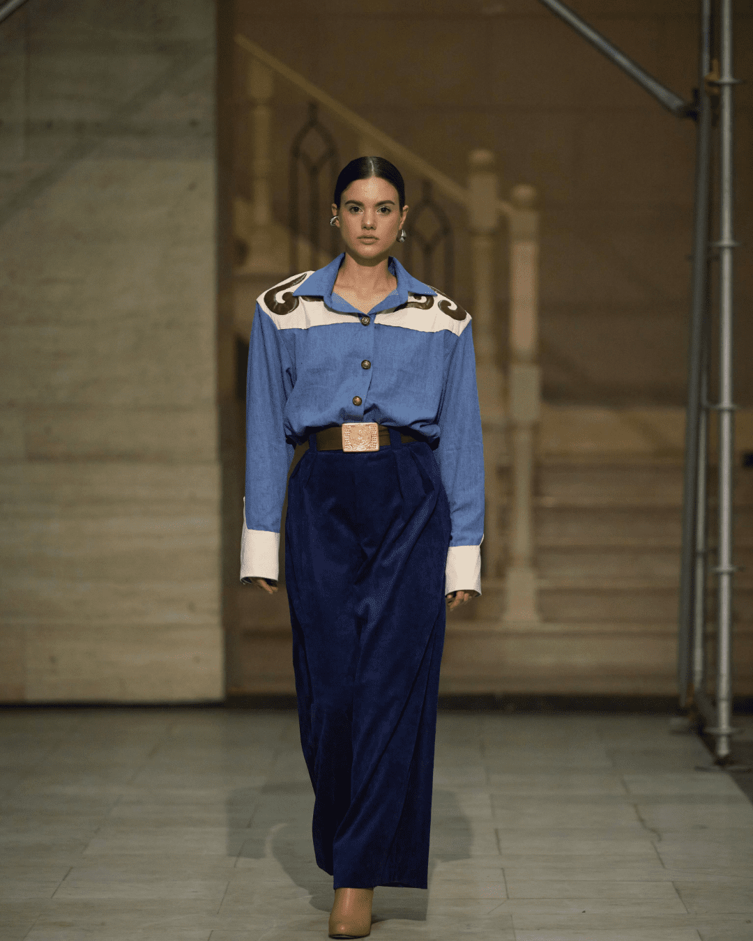 De los mapas surge una ruta inesperada hacia el Oeste, donde el espíritu vaquero cobra vida. La estética cowboy se traduce en blazers con carácter, sacos estructurados, pantalones anchos y camisas que evocan libertad. La conexión sigue su curso hacia la música country, que nos lleva al blues, y el blues nos remite a la madera, a lo rústico, a la esencia. Es aquí donde el cuero de shiringa entra en escena, evocando la calidez de los instrumentos que cuentan historias de tiempos pasados.