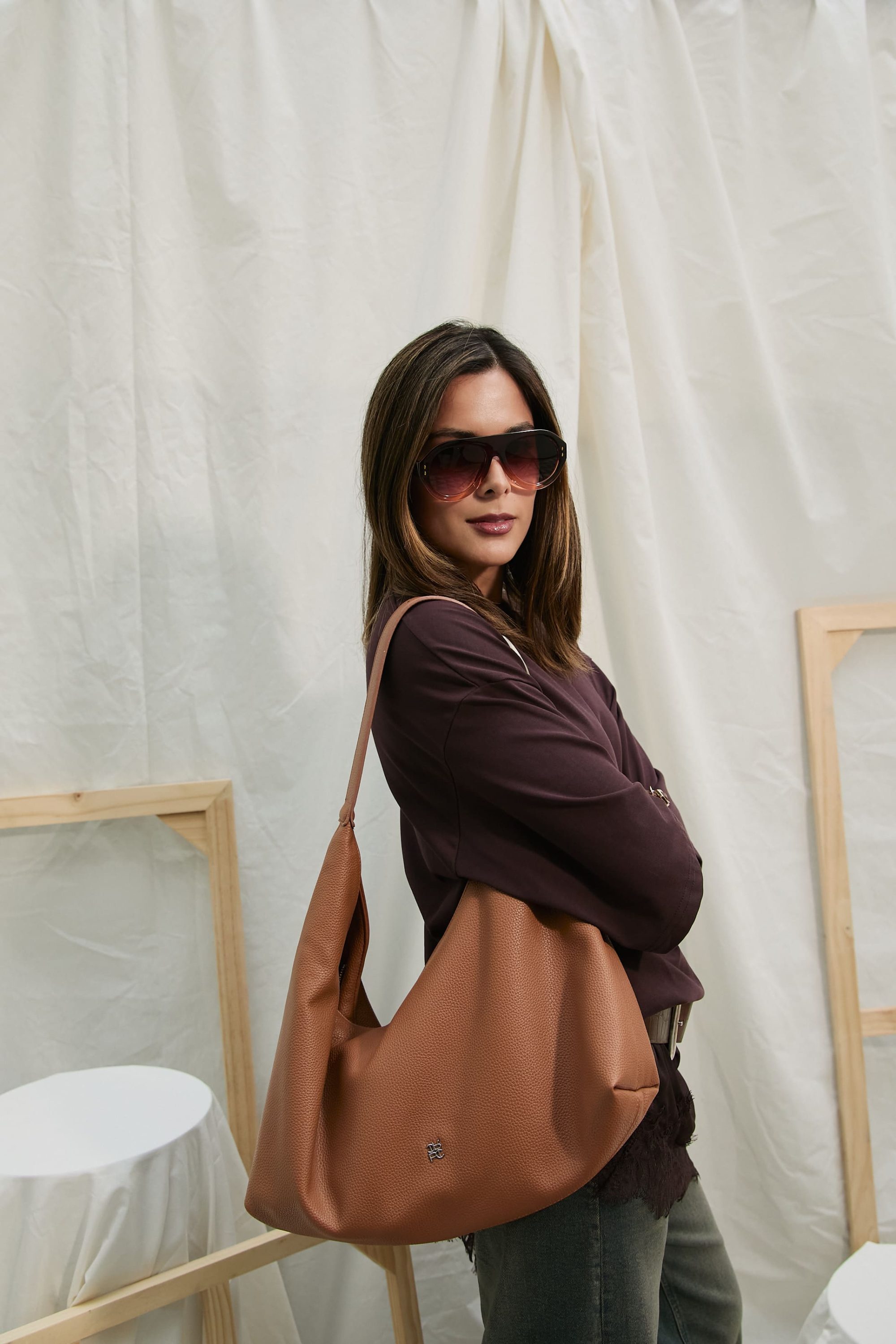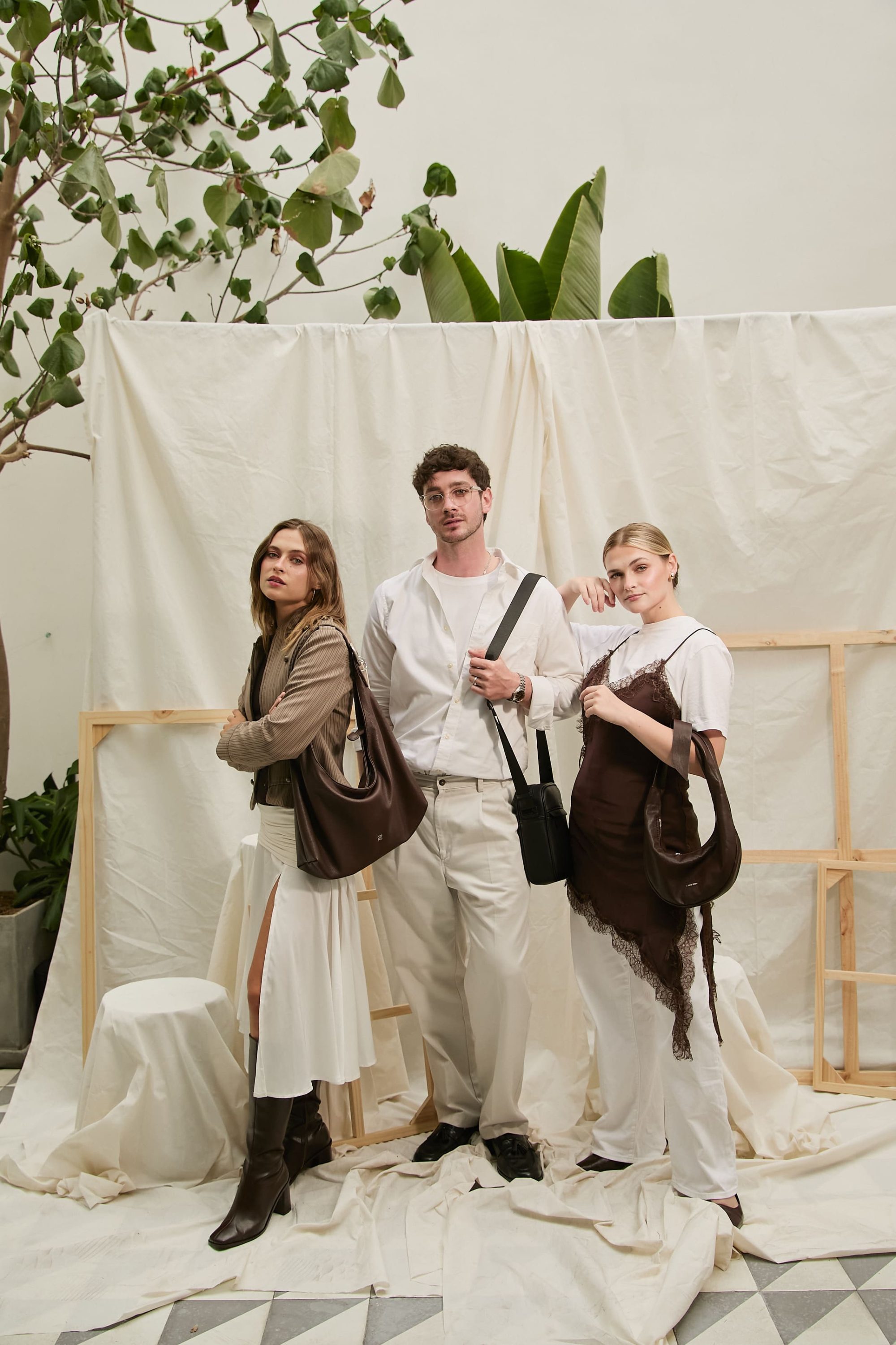 La paleta de color se mueve con naturalidad entre tonos neutros y matices actuales, logrando combinaciones versátiles que no buscan imponerse, sino integrarse. Las siluetas —baguettes, hobos— aparecen como formas familiares, pero reinterpretadas desde materiales que aportan profundidad, como las texturas tipo gamuza, y detalles como los flecos, que suman movimiento y carácter sin caer en lo evidente.