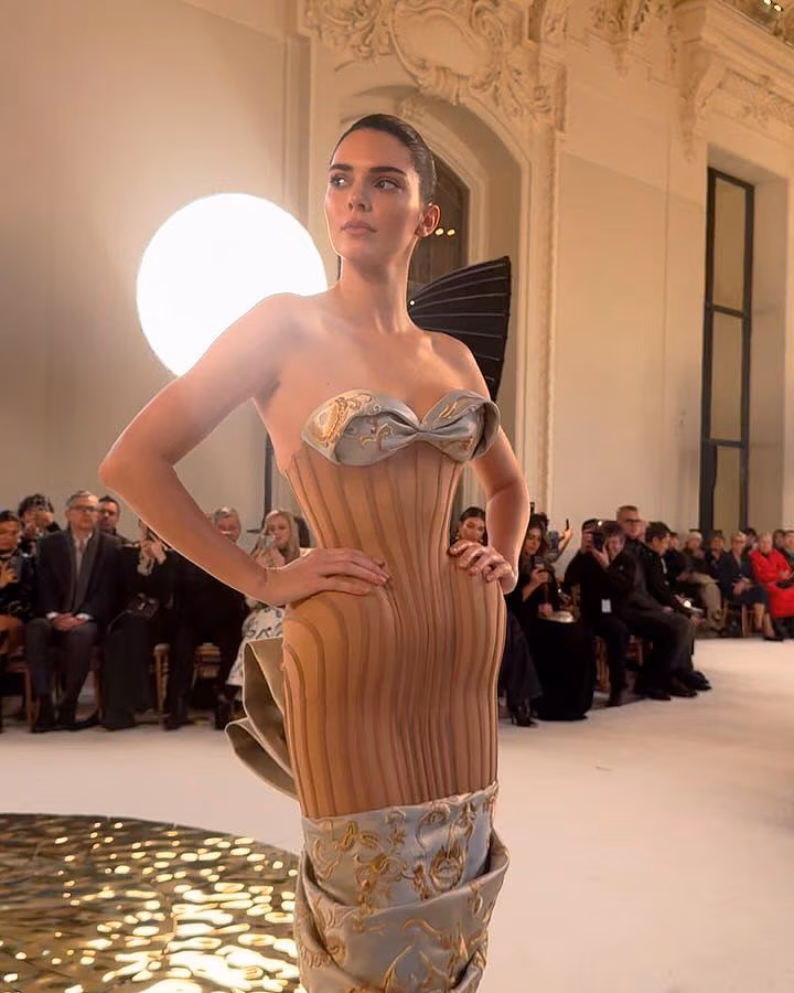 Kendall Jenner abrió la pasarela luciendo un vestido estructural con detalles dorados, haciendo alusión a los icónicos motivos surrealistas de la firma, que han definido la estética de Schiaparelli a lo largo de las décadas. Su presencia reafirmó el lugar de la marca como un puente entre el arte y la moda contemporánea.