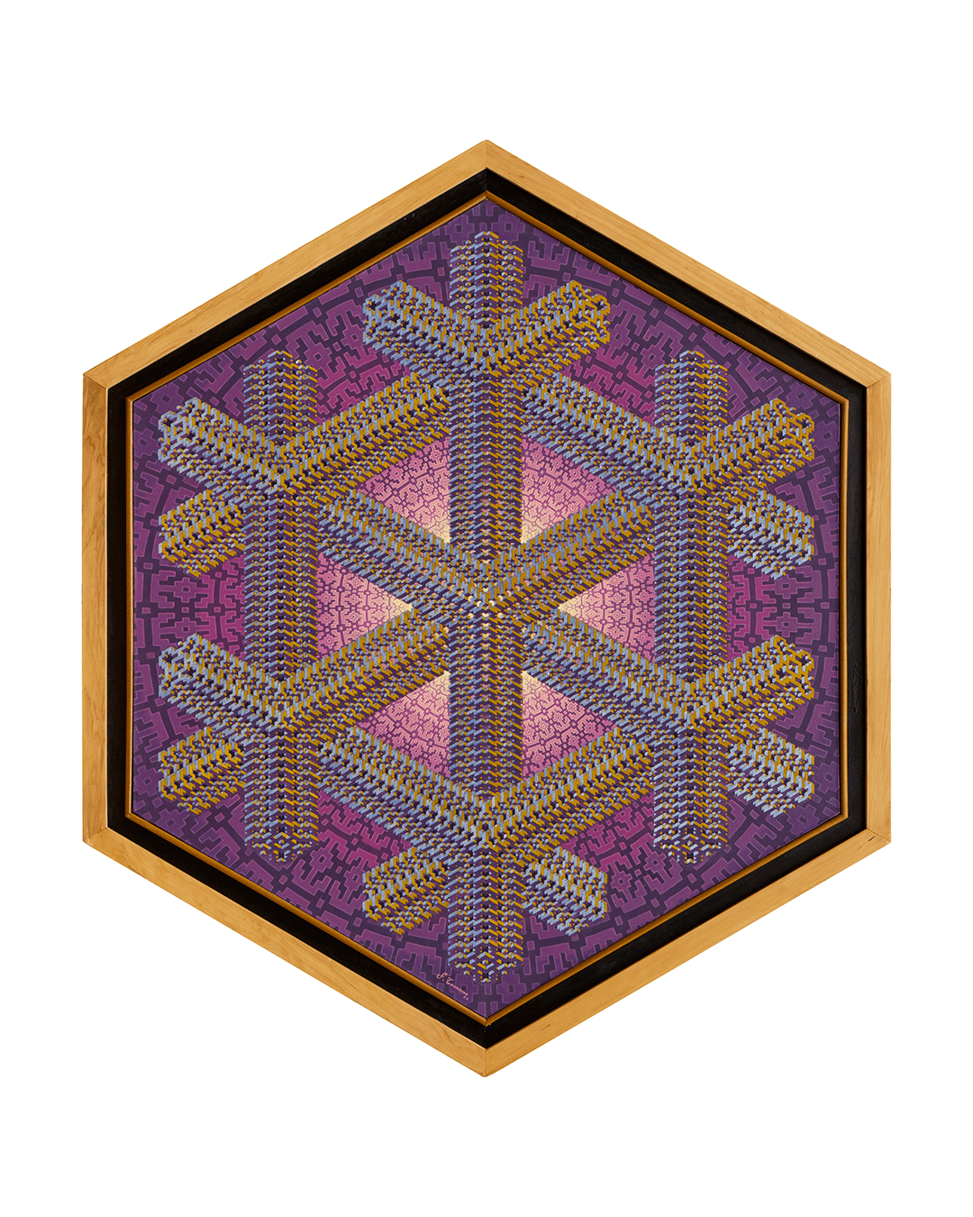 El segundo puesto ha sido obtenido por el artista Fredy Tuanama Guerra, por su obra “El Huishmabu”, inspirada en la leyenda shipiba de los hijos del Sol y la Luna, también conocida como la leyenda de Huishmabu, que narra la historia sobre los orígenes de este pueblo indígena. La obra hexagonal emplea patrones kené con efecto 3D, formando una figura que conecta identidad, historia y espiritualidad. El artista recibirá un premio adquisición de S/ 20,000 como reconocimiento a su trabajo.