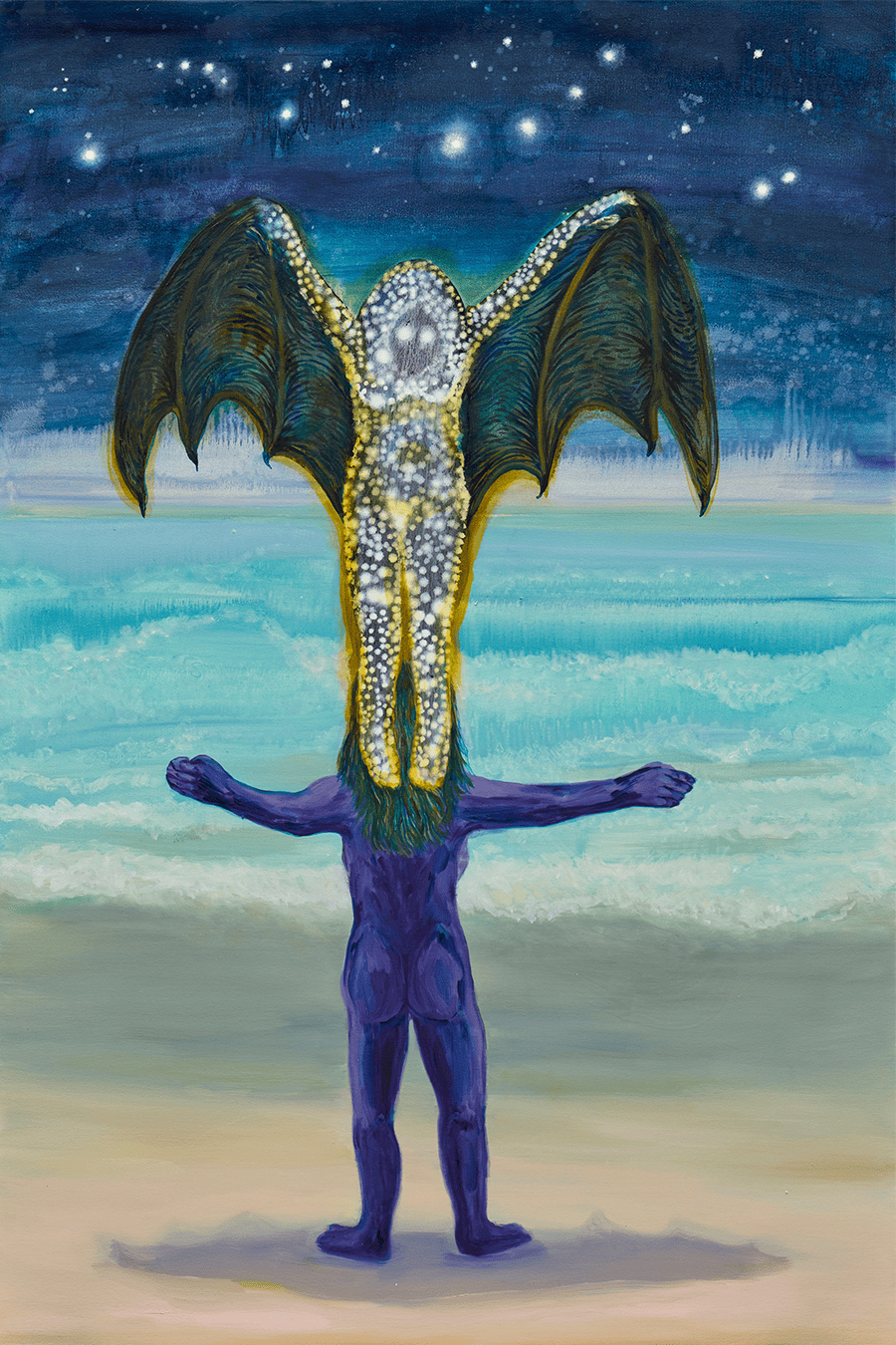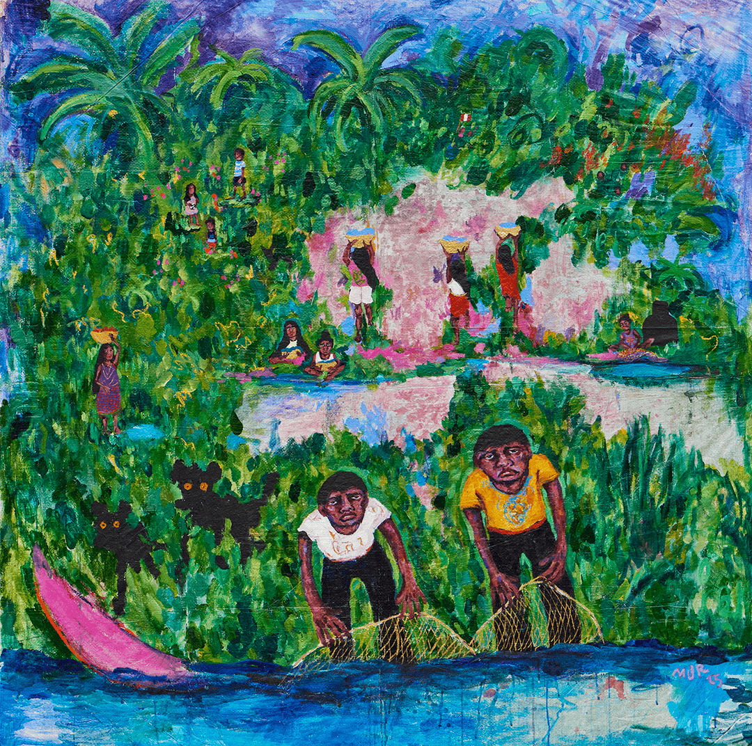 La obra se centra en una escena de pescadores de la comunidad awajún de Puerto Linda (Perú) y se vincula con el realismo mágico al entrelazar lo cotidiano con una atmósfera poética. Pintada sobre polipropileno, material común en las bolsas de mercado y presente en la vida diaria amazónica, la artista lo utiliza como un gesto simbólico hacia las historias y cargas personales. En un contexto donde la Amazonía enfrenta profundos conflictos, hablar desde el cariño se vuelve también una forma de comprender aquello que estamos destruyendo.