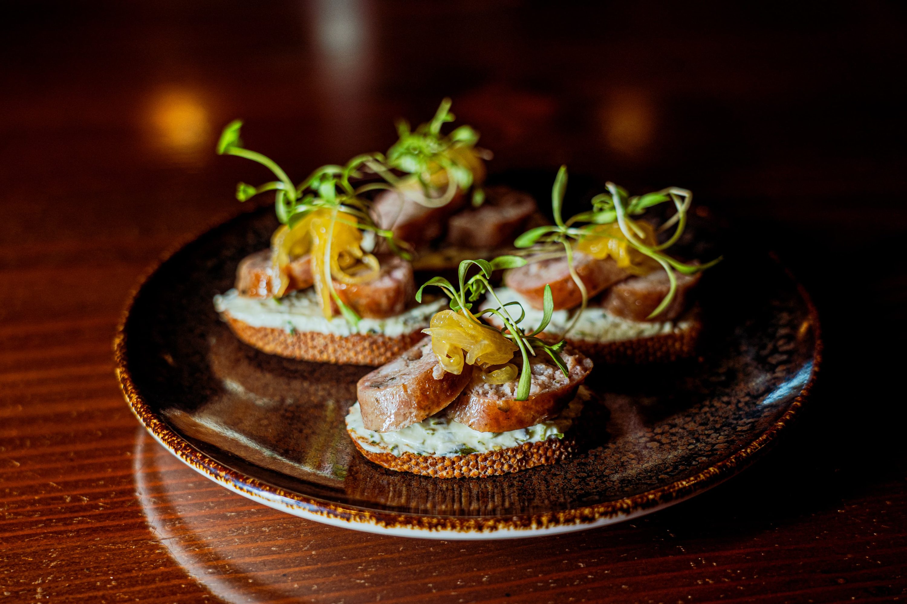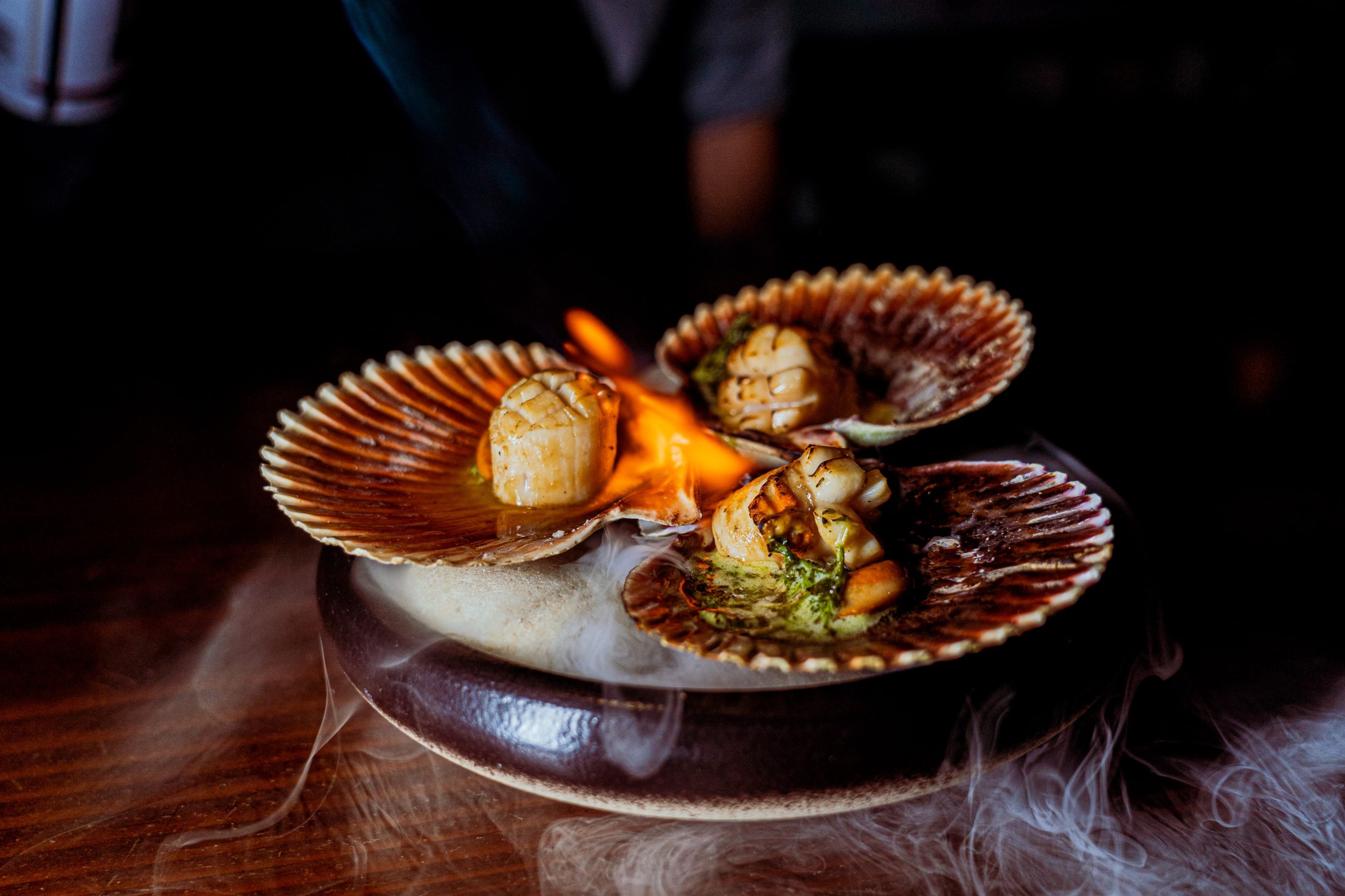 confitado y albahaca frita); Bruschetta de chorizo (tostada con crema de chimichurri y queso, coronada con chorizo de la casa y cebolla caramelizada a la naranja); Ostras acevichadas al ají amarillo (Ostras de casma en una salsa de leche de tigre al ají amarillo y chalaquita clásica); Conchas parrilleras (conchas de abanico jumbo salteadas, cocidas al grill, flameadas al pisco y bañadas en mantequilla ahumada al chimichurri); Crepe de salmón (salmón ahumado, queso crema, cebolla caramelizada y pimiento morrón enrollado en una crepe); Molleja de res anticuchero (molleja de res cocida en salsa anticuchera clásica, acompañado con ají pollero y jalea de rocoto picante); Tartare de salmón acevichado (salmón picado mezclado con palta ahumada, rabanito encurtido y salsa de leche de tigre, acompañado de tostadas); y Pastrami de picaña (picaña curada por 10 días y ahumada en leña de manzano).