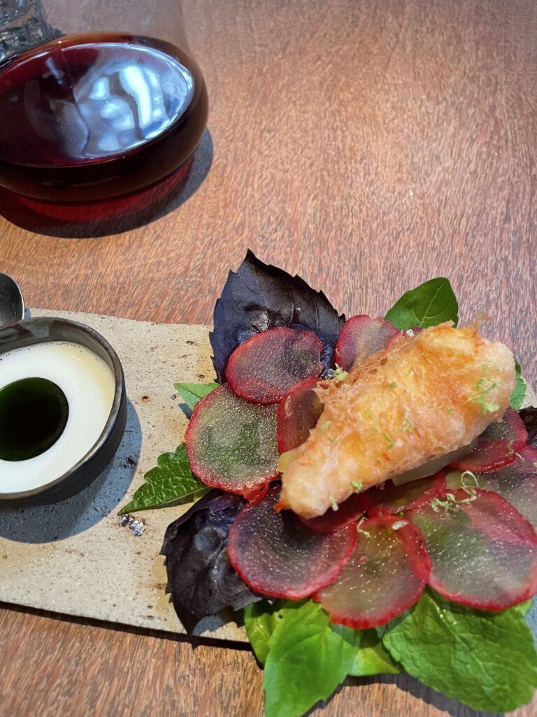 Camarón con hojas de albahaca rojas y verdes, con salsa de leche de almendra