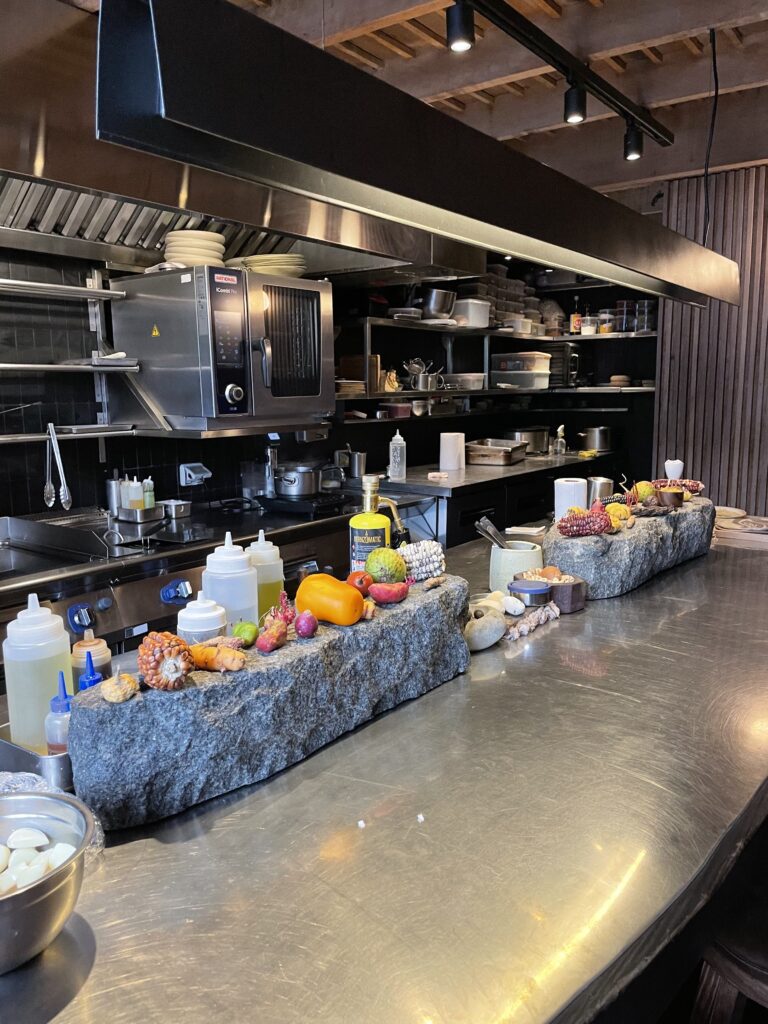 Desde su entrada, en cuentas en la parte baja una pequeña cocina acogedora con una barra personal de atención, ya inicias a respirar una arquitectura minimalista, acogedora, y en donde las maderas y la piedra del espacio te acogen en un ecosistema perfecto.