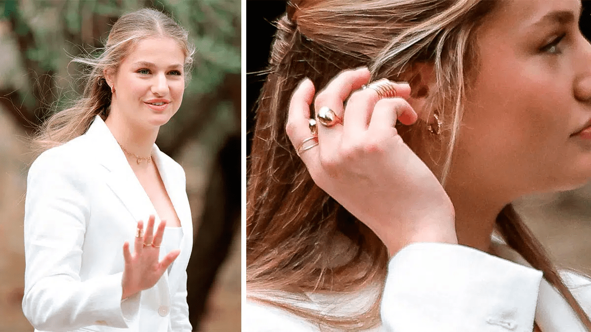 Durante su aparición en los Premios Princesa de Girona en marzo, Leonor sorprendió al llevar hasta cinco anillos midi distintos de firmas como Suma Cruz y PDPAOLA, cuatro en una mano y uno en la otra. Elegidos con mimo, esos accesorios destacaron sobre su look de americana blanca y pantalones de lino beige, reflejando cómo los pequeños detalles pueden transmitir familiaridad, juventud y elegancia discreta.