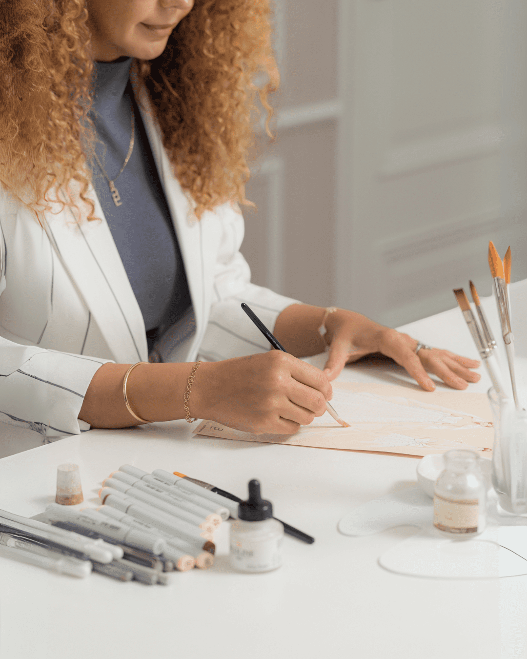En su taller, materiales de alta gama, sedas naturales, mikado italiano, chantilly francés, brocados, guipur bordado, pedrería personalizada con símbolos o frases significativas, así como tules y organzas premium entre otros, se transforman en piezas que celebran la elegancia en su forma más pura y silenciosa.