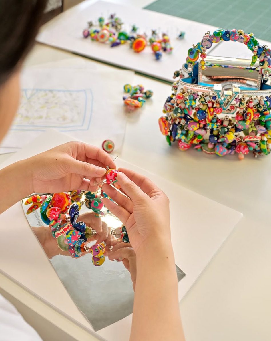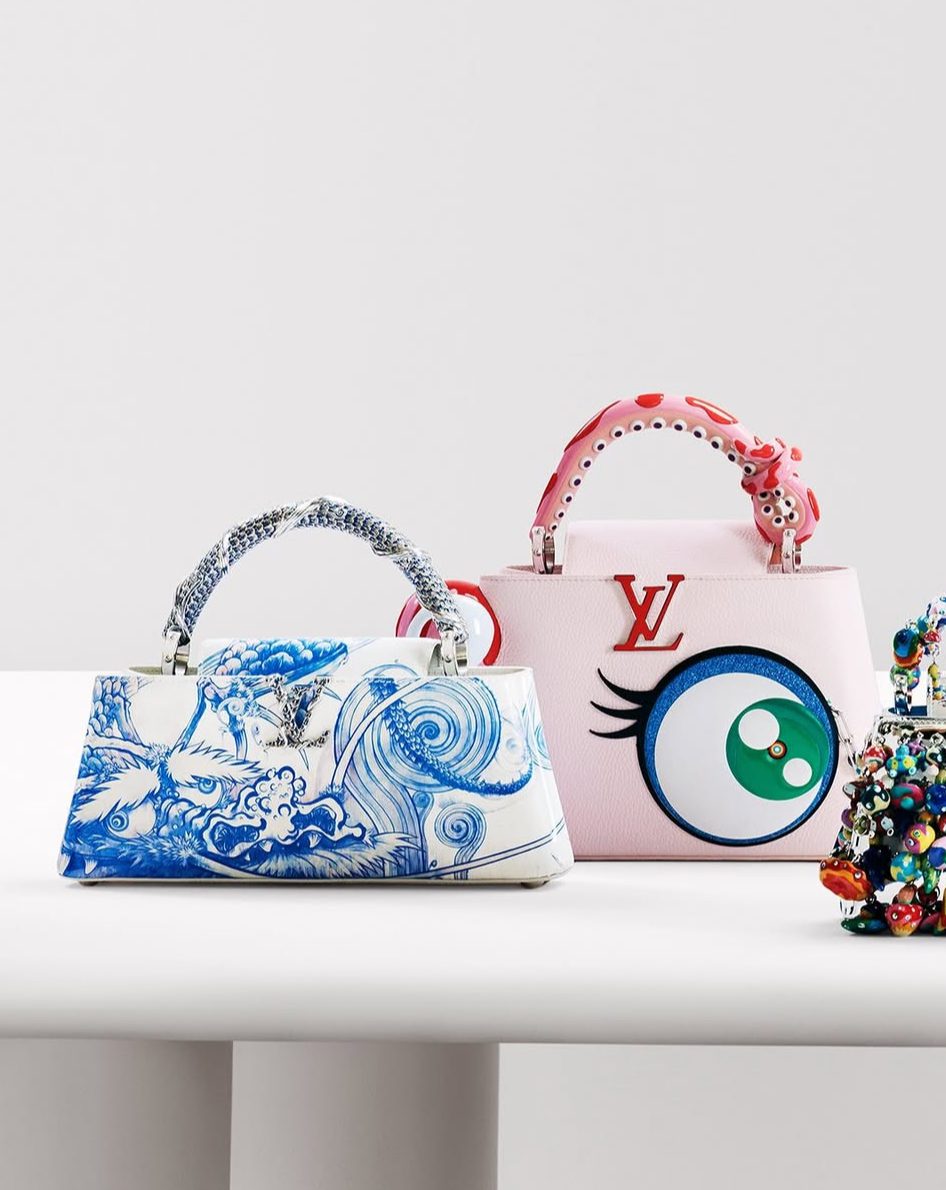 a colección, lanzada en el marco de Art Basel Paris, incorpora el universo visual de Murakami, flores sonrientes, personajes icónicos y colores vibrantes, dentro del ADN artesanal de Louis Vuitton. Desde iconos como el Capucines BB Golden Garden hasta el Capucines Mini Mushroom y Mini Tentacle, cada diseño fusiona el detalle técnico de la maison con la imaginación libre del artista.