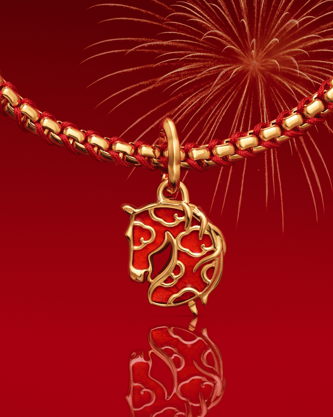 Como complemento, el Brazalete de cadena de serpiente con cordón rojo retoma uno de los símbolos más reconocidos de esta celebración. El color rojo es tradicionalmente utilizado para atraer la buena suerte y alejar las energías negativas, y en esta versión se integra de manera sutil y moderna, permitiendo personalizar la pieza con charms que reflejen intenciones personales para el nuevo año.