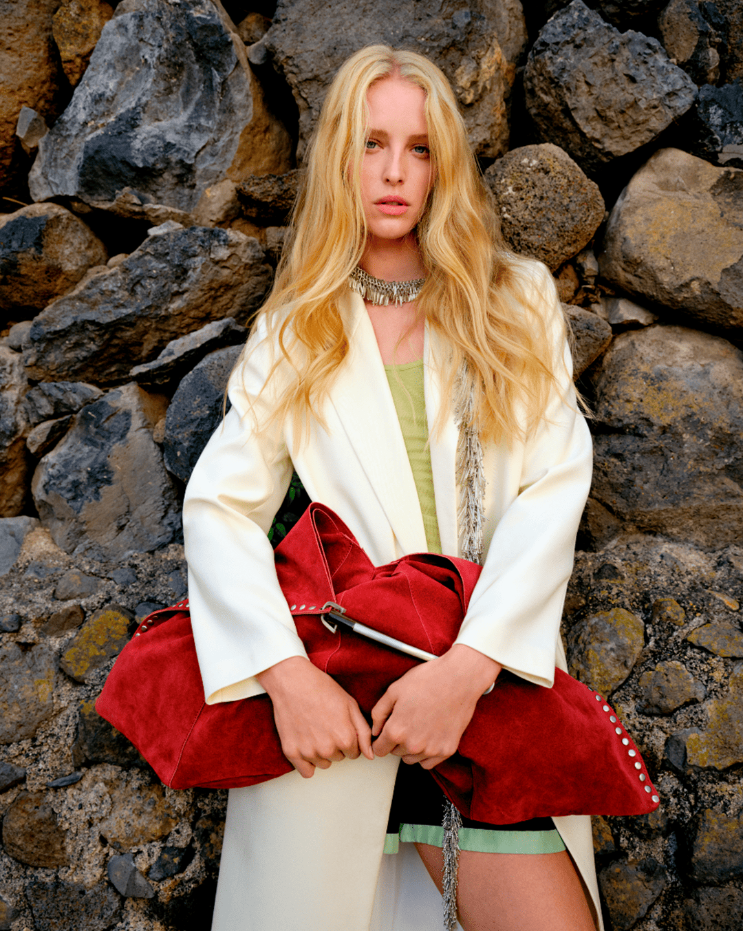 os bolsos se convierten en compañeros de ruta: maxi para viajes largos, mini para escapadas urbanas. Confeccionados en materiales como ante, crochet y satén, se enriquecen con asas de madera, flecos y acabados láser que realzan su carácter artesanal. Los zapatos siguen la misma narrativa, con sandalias de inspiración étnica en tonos chocolate, decoradas con borlas y detalles artesanales. La joyería, de formas orgánicas y acabados en plata, refuerza esa conexión con lo natural.