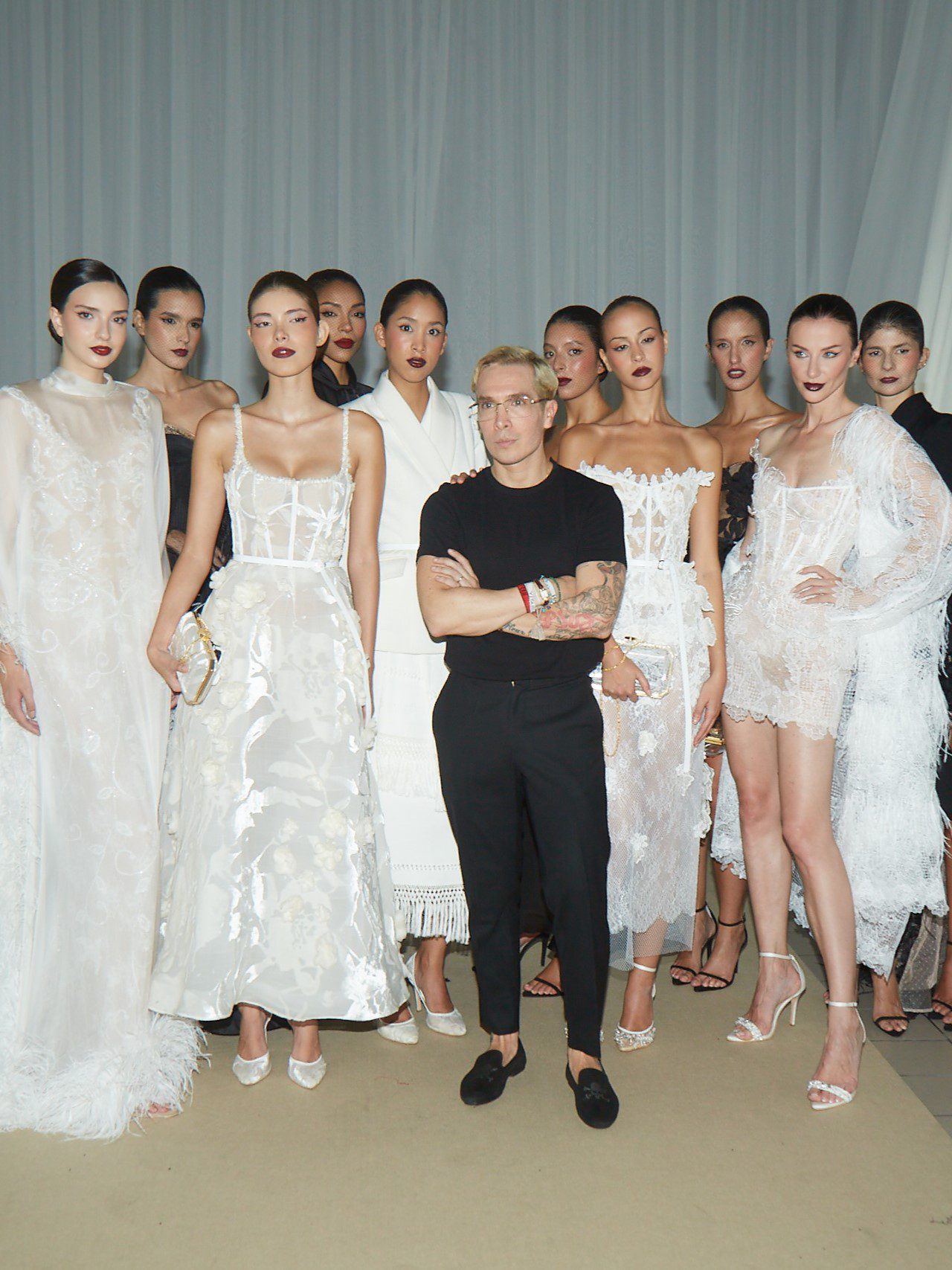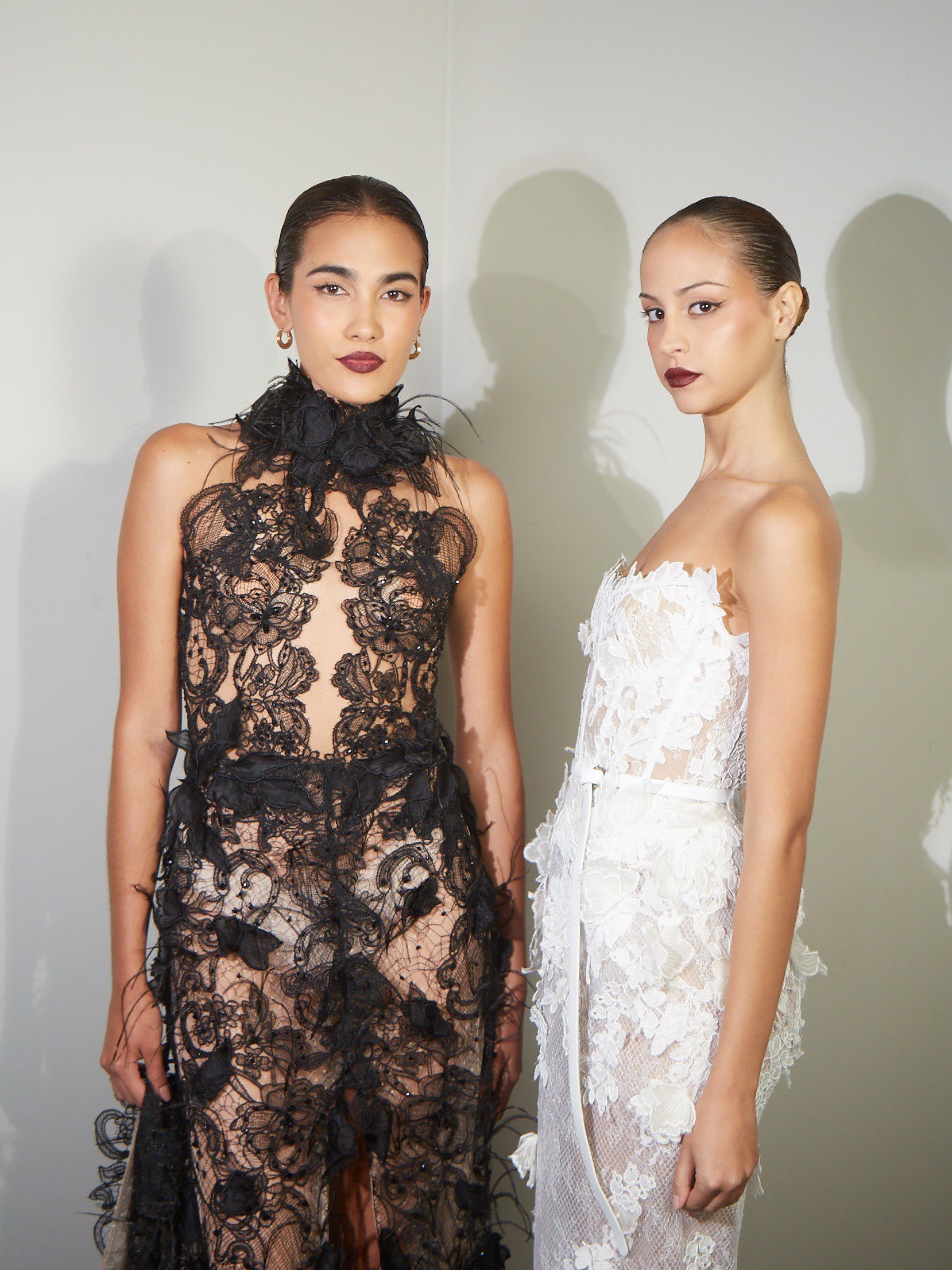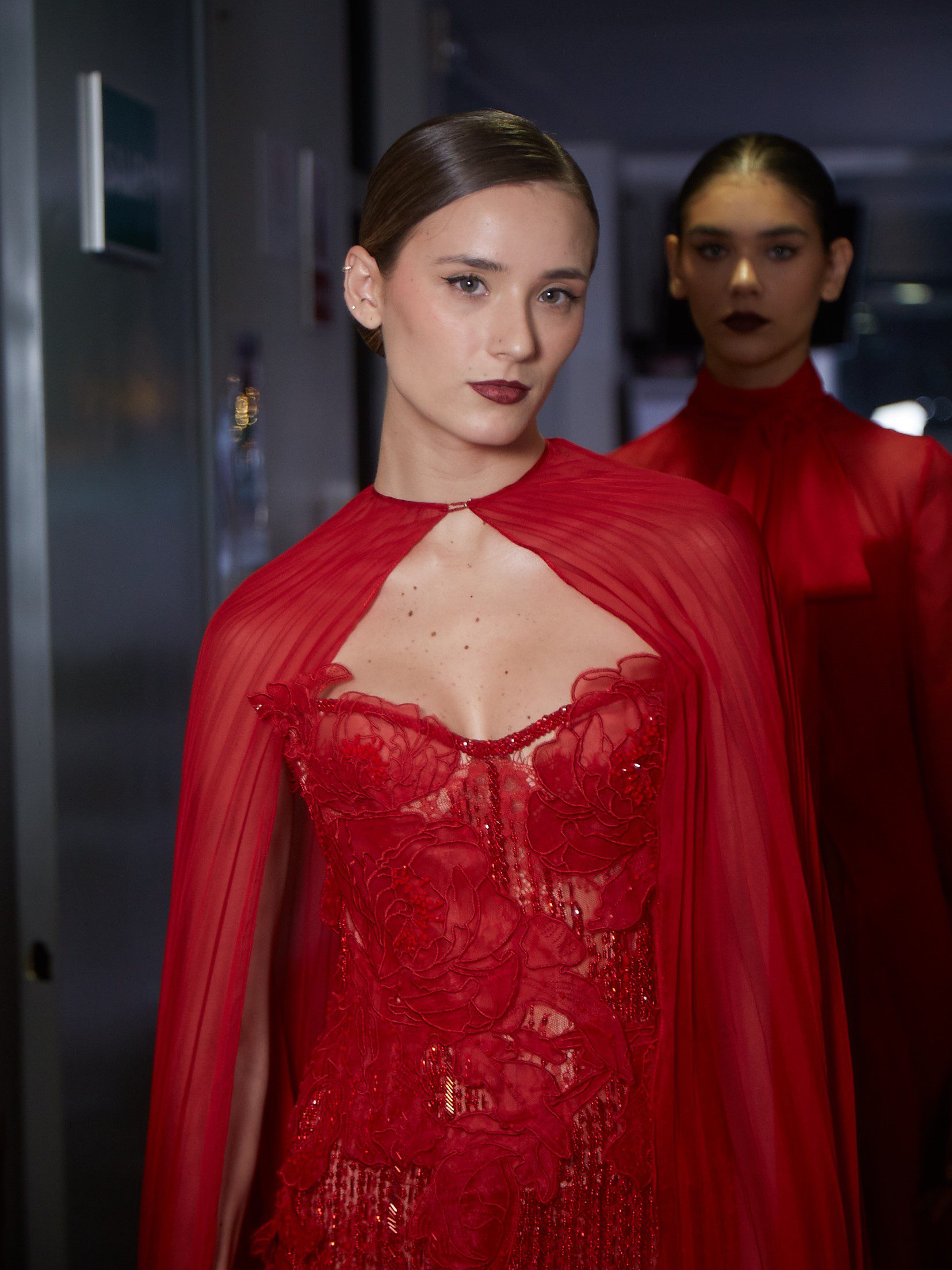 Desde vestidos de caída fluida con capas de gasas naturales hasta estructuras impecables que realzan la silueta femenina, cada diseño ha sido creado y aplicado a mano con un meticuloso trabajo artesanal. Además, incorporamos conjuntos tejidos a mano por nuestras talentosas artesanas de Cajamarca, donde cada pieza de sastrería ha sido elaborada en telar, fusionando tradición y alta moda.